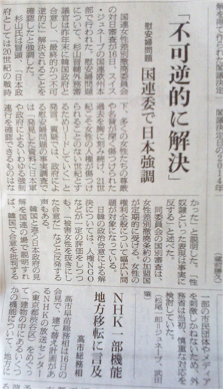 日本政府の、国連委での慰安婦問題の態度表明を報じる朝日新聞に驚いた。
