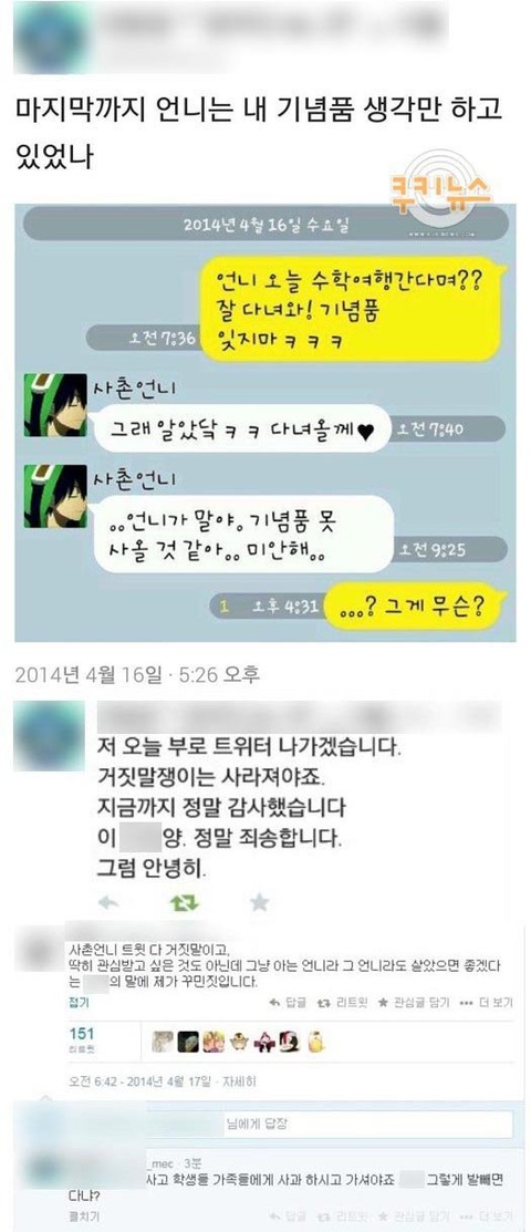 旅客船沈没事故の当日である16日、あるネチズンがツイッターに「最後まで姉さんは僕への
