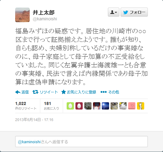 福島みずほの疑惑です。居住地の川崎市の○○区まで行って証拠揃えたようです。
